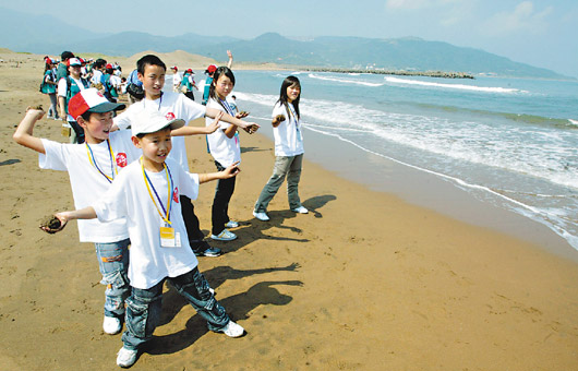 由于臺風(fēng)剛過,海灘滿布垃圾、漂流木,主辦單位為避免從未看過海的小朋友失望,特別讓他們走到海邊,但是不可以脫鞋。小朋友們彎腰玩水,也有人堆起沙堆或是抓起海沙猛力丟向大海。潮水涌上時,人人急著往回奔,來不及的人鞋子打濕,但依然玩得很高興。在四川地震中救出多名同學(xué)的高一生王祖全還用寶特瓶裝了半瓶海沙,他說,家鄉(xiāng)不靠海,要把海沙帶回家當(dāng)紀(jì)念。