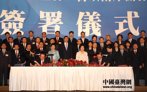 資料圖:海協(xié)會(huì)會(huì)長(zhǎng)陳云林與海基會(huì)董事長(zhǎng)江丙坤11月4日下午在臺(tái)北簽署海運(yùn)、空運(yùn)、通郵和食品安全等四項(xiàng)協(xié)議。(攝影:田云鵬)