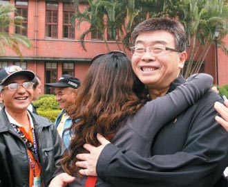 陳水扁案起訴前,到臺(tái)“立法院”參觀的民眾認(rèn)為國(guó)民黨“立委”邱毅(右)揭弊有功,紛紛上前擁抱打氣。(圖片:臺(tái)灣《聯(lián)合報(bào)》)