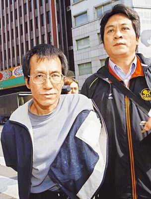 男子王建富(左)昨天上午朝臺“特偵組”丟玻璃瓶砸窗,被便服警員押回偵辦。(臺灣《蘋果日報》圖片)