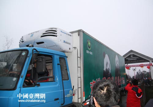 12月23日,四川雅安碧峰峽基地舉行大熊貓赴臺啟動儀式。運載“團團”、“圓圓”的運輸車駛出碧峰峽基地。中國臺灣網 田云鵬 攝