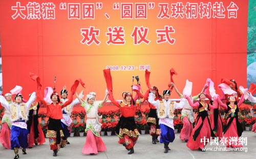 12月23日,成都雙流機場為贈臺大熊貓和珙桐樹苗舉行歡送儀式,這是歡送儀式開始前現場表演少數民族歌舞。中國臺灣網 田云鵬 攝