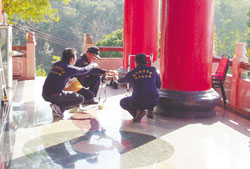 平日教導武術練功的彰化花壇鄉達摩卦山少林寺,9日遭歹徒行搶,兇嫌持槍打中廟祝陳金鈿左胸。案發后,臺警方趕到現場搜證。臺灣《中國時報》圖片