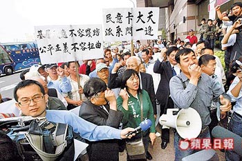 力挺前陳水扁辦公室秘書(shū)長(zhǎng)陳唐山參選臺(tái)南縣長(zhǎng)的民進(jìn)黨員,昨發(fā)動(dòng)5輛游覽車(chē)北上臺(tái)北陳情抗議,要求民進(jìn)黨中央盡速?zèng)Q定提名人選。來(lái)源:臺(tái)灣《蘋(píng)果日?qǐng)?bào)》