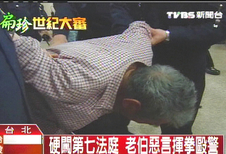 據(jù)臺媒報道,臺北地方法院今在第七法庭開庭審理扁家弊案,法庭外一位70多歲的老者不聽法警勸說要硬闖第七法庭,觀看陳水扁的庭訊過程。為維持法院秩序,多名法警將這位老者圍住希望將其帶離現(xiàn)場,沒想卻引來老者的反抗和辱罵,混亂中一名法警被老者揮拳打中。最后在人數(shù)優(yōu)勢下,法警把這名老者架離法院現(xiàn)場。