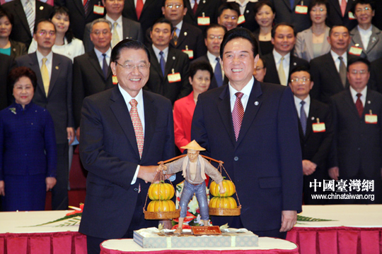 陳云林向江丙坤贈送一幅云錦。26日下午,在成功簽署《海峽兩岸空運補充協(xié)議》、《海峽兩岸金融合作協(xié)議》、《海峽兩岸共同打擊犯罪及司法互助協(xié)議》等三項協(xié)議后,陳云林與江丙坤互贈紀念品。(中國臺灣網(wǎng) 鐘寶華 攝)