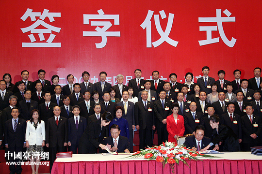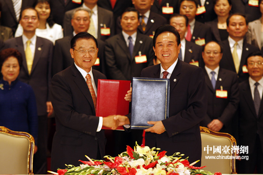 海協(xié)會會長陳云林與海基會董事長江丙坤簽署三項(xiàng)協(xié)議。26日下午三時(shí)許,海協(xié)會會長陳云林與臺灣海基會董事長江丙坤在南京紫金山莊正式簽署《海峽兩岸空運(yùn)補(bǔ)充協(xié)議》、《海峽兩岸金融合作協(xié)議》、《海峽兩岸共同打擊犯罪及司法互助協(xié)議》。(中國臺灣網(wǎng) 鐘寶華 攝)