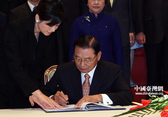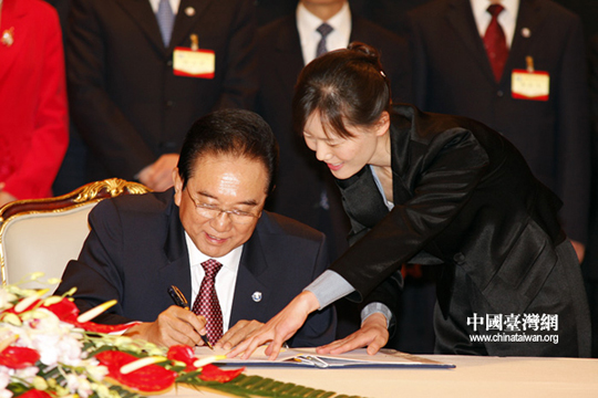 海協(xié)會會長陳云林簽署協(xié)議。26日下午三時(shí)許,海協(xié)會會長陳云林與臺灣海基會董事長江丙坤在南京紫金山莊正式簽署《海峽兩岸空運(yùn)補(bǔ)充協(xié)議》、《海峽兩岸金融合作協(xié)議》、《海峽兩岸共同打擊犯罪及司法互助協(xié)議》。(中國臺灣網(wǎng) 鐘寶華 攝)