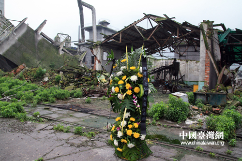 人們?cè)趶S區(qū)的入口擺上花籃憑吊地震中的罹難者。 (中國(guó)臺(tái)灣網(wǎng) 田云鵬 攝)
