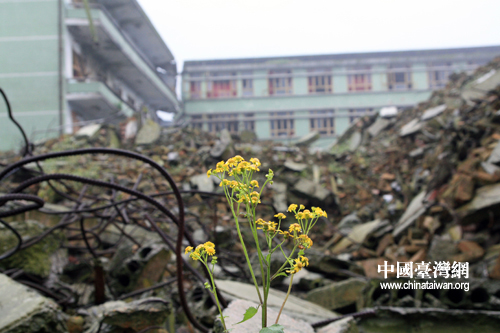 在地震遺址,處處都可見(jiàn)到這樣的黃色小花在廢墟上頑強(qiáng)地生長(zhǎng)著。(中國(guó)臺(tái)灣網(wǎng) 田云鵬 攝)