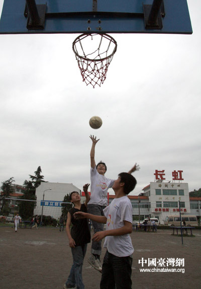 北川中學的學生正在進行體育運動。北川中學師生目前被臨時安置在長虹公司的培訓中心,共有61個班3082名學生,教師210名。新北川中學的建設將于今年5月12日開工,明年9月1日,將在新學校中舉辦開學典禮。(中國臺灣網 田云鵬 攝)