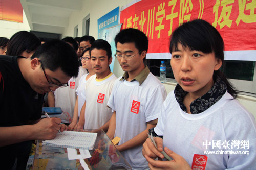 綿陽師范大學的師生正在為援建北川中學進行《愛在北川學子吟》的義賣活動。(中國臺灣網 田云鵬 攝)