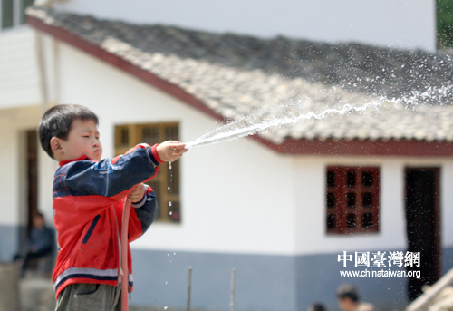 棗樹村,5歲的尚鑫波正在聚精會神地給自家正在修建的房屋澆水,讓鋼筋混凝土結(jié)構(gòu)的房體保持濕度。他身后是已經(jīng)投入使用的新民居。 (中國臺灣網(wǎng) 田云鵬 攝)