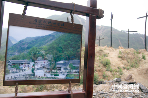 東河口地震遺址公園,圖中此地海拔778米,被掩埋110米。背景中是川北民居中傳統(tǒng)的“穿斗挑梁”殘骸,它們在地震后被樹立起來,紀(jì)念罹難的同胞。(中國臺灣網(wǎng) 田云鵬 攝)