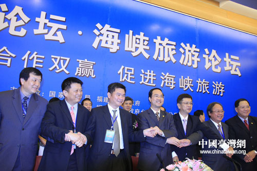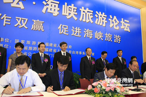 大陸25個赴臺旅游地省市旅游局在論壇上共同簽署《打造“小三通”旅游黃金通道合作宣言》。福建省旅游協會和臺灣六大旅游公會簽訂《閩臺旅游合作品質保障協議》。(記者 鐘寶華 許雯)