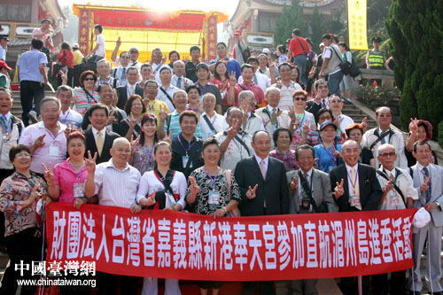 祭祀媽祖祈福大典在湄洲媽祖祖廟廣場舉行,圖為臺灣信眾合影。(中國臺灣網記者 張弛 攝)