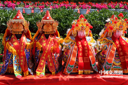 記者看到,在今天的祭祀大典儀式上,這四尊媽祖像被安放在了祭祀主壇上。左邊的兩尊黑臉媽祖像身披“新港奉天宮”的紅帶子,而另兩尊粉臉媽祖像的紅帶子上則寫著“大甲鎮瀾宮”。據中壢朝明宮的臺灣信眾吳富貞介紹,這四尊媽祖像是用臺灣優質木材,耗時2個月打造,價格在幾萬臺幣左右。雖然價格不高,但是新港奉天宮和大甲鎮瀾宮為了此次直航祭祖大典而打造的,算是首次“回娘家”。