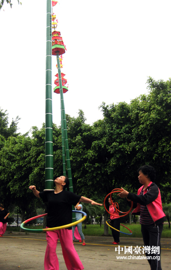 中國臺(tái)灣網(wǎng)5月18日泉州消息 雖然海峽論壇·第三屆海峽巾幗健身大賽展示項(xiàng)目的決賽將在19日晚上才正式開始,但記者今天下午在泉州僑鄉(xiāng)體育中心內(nèi)看到,來自南平代表團(tuán)的展示項(xiàng)目隊(duì)己經(jīng)練習(xí)了起來,并且吸引了許多泉州市民的圍觀。