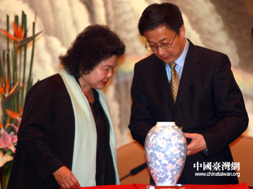 5月23日下午,上海市市長韓正在上海興國賓館會見了高雄市市長陳菊,陳菊向韓正贈送精美禮品。(中國臺灣網 田云鵬 攝)