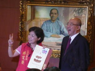 國(guó)民黨“立院”黨團(tuán)書記長(zhǎng)楊瓊瓔送上在場(chǎng)所有人簽名的賀卡。(圖片來源:人民網(wǎng))