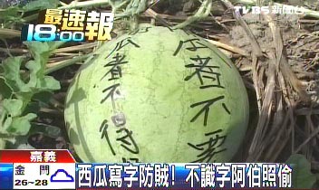臺灣婦人西瓜上寫字防賊。來源:臺灣TVBS電視臺