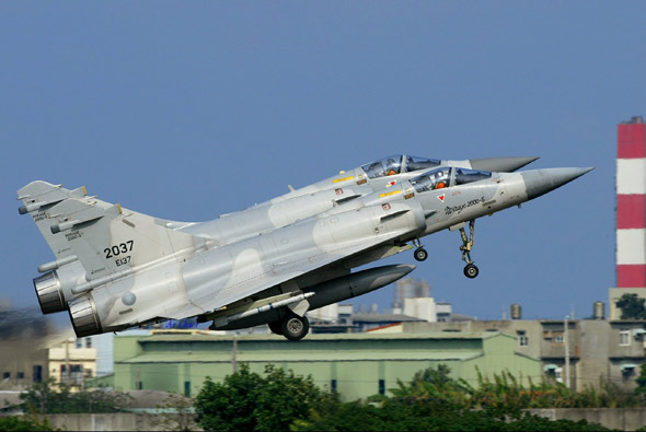 陳金龍是臺空軍首位幻影戰(zhàn)機飛行員,圖為臺灣空軍幻影2000-5雙機編隊起飛。(圖片來源:人民網(wǎng))
