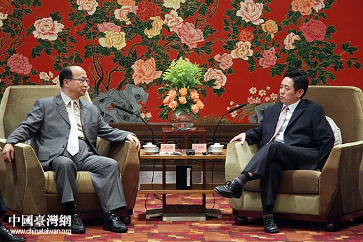 6月26日下午,北京市副市長丁向陽在京會見了臺灣中部四縣市負責人。丁向陽同臺中市市長胡志強交談。(中國臺灣網 鐘寶華 攝)