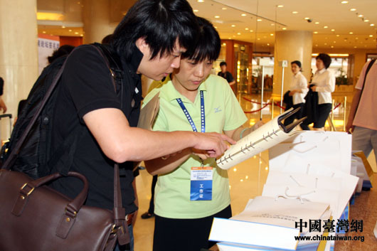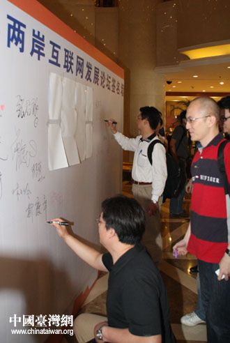 出席“2009兩岸互聯(lián)網(wǎng)發(fā)展論壇”的近百名臺灣嘉賓7月6日陸續(xù)抵達北京。圖為臺灣嘉賓在簽名墻上簽名留念。(中國臺灣網(wǎng) 鐘寶華 攝)