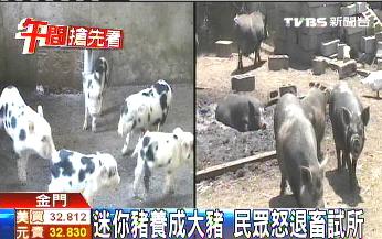 中國(guó)臺(tái)灣網(wǎng)7月23日消息 據(jù)臺(tái)灣TVBS電視臺(tái)報(bào)道,臺(tái)灣金門一位許姓民眾,3年前向金門畜產(chǎn)試驗(yàn)所買了一對(duì)“迷你豬”,養(yǎng)了3年后,“迷你豬”卻變成100公斤重的大豬,還生了很多大豬,他決定要抗議,把“這些不迷你的迷你豬”,還給金門畜產(chǎn)試驗(yàn)所。