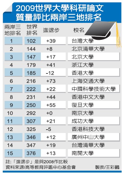 中國臺灣網7月30日消息 據臺灣《聯合晚報》報道,2009世界大學科研論文排名結果今天公布,臺灣有7所大學挺進世界500強,在兩岸三地的總體評比中,臺灣大學排名第一;在分領域評比中,成功大學工學院的表現亮麗,首次超越臺大工學院。