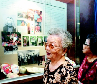 “慰安婦”阿嬤吳秀妹(左)與盧滿妹(右)今天上午出席“月光——‘慰安婦’生命故事影像展”揭幕記者會,并共同參觀攝影展。圖片來源:臺灣《聯合晚報》
