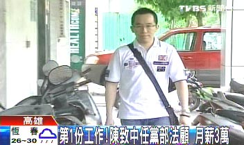 陳致中正式成為民進(jìn)黨高雄市黨部有給職法律顧問,月薪3到4萬元新臺(tái)幣。來源:臺(tái)灣TVBS電視臺(tái)