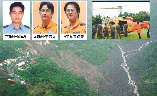 霧臺、三地門山區已經被困5天,昨天上午一放晴,臺灣空勤總隊立刻出動4架直升機,一整天來回10余次運送物資,并運送了73名災民下山。約昨天下午3時許,UH-1H502直升機從屏東縣內埔農工起飛,不到10分鐘警方就接獲報案“直升機掉下來了”,救難人員不敢置信,一名官員曾智勇直說:“前一秒還在我的眼前起飛,怎么可能掉下去呢?”