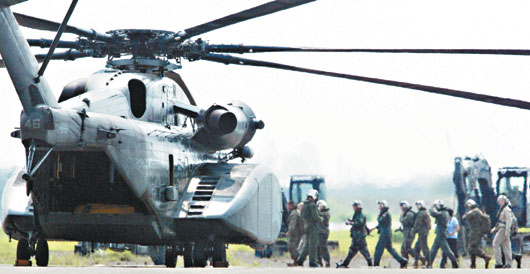美方馳援臺灣“88水災(zāi)”的MH-53E型“種馬”直升機昨天飛抵臺軍的臺南軍用機場。圖片來源:臺灣《聯(lián)合報》