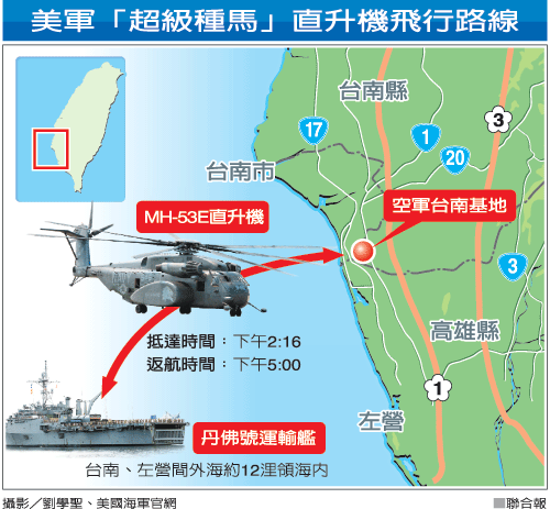 美軍第一架MH-53E直升機昨天下午飛抵臺軍的臺南軍用機場,一個美方協(xié)調(diào)小組隨機抵達(dá),進行先期救災(zāi)協(xié)調(diào)工作,預(yù)定今天正式展開行動。AIT新聞科長萬德福指出,因考慮后勤、維修等因素,美軍直升機在臺灣內(nèi)部執(zhí)行救援任務(wù)后都將飛返“丹佛號”,不停留過夜。