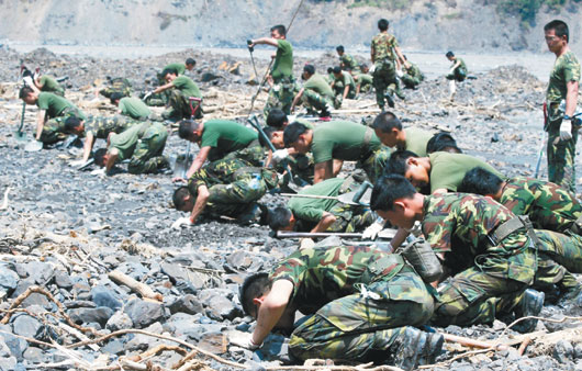 在六龜鄉(xiāng)新開部落搜救的臺軍官兵,昨天趴在可能埋尸的泥石流現(xiàn)場,用鼻子聞土壤中有無酸味,再用鏟子挖土,希望找到罹難者遺體,可惜尚無所獲,“雖然很累,但為了罹難者也要拼下去。”