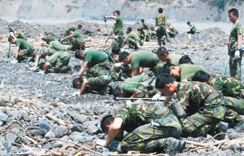 2009年8月17日,在六龜新發村新開部落,臺軍為尋找罹難者遺體,連鼻子都用上了,為防止疏漏,士兵排成一列趴在土石上一寸寸地聞,遇有異味再開挖,令人感動。圖片來源:臺灣《聯合報》