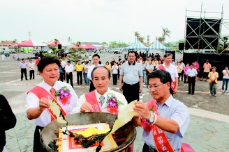 臺“立法院長”王金平(中)率宜蘭縣長呂國華(右)、臺東縣副縣長彭德成(后右一)及花蓮縣“立委”傅昆萁(左)和縣議會議長楊文值(后中)等人,在花蓮不分族群和宗教舉行聯合祈福祭天法會。(圖片來源:臺灣《聯合報》)