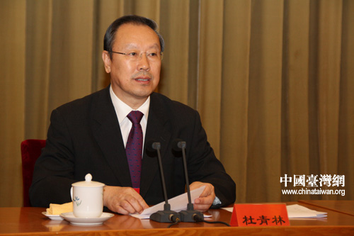中國和平統一促進會第八屆理事大會23日在京舉行。全國政協副主席、中共中央統戰部部長、大會執行主席杜青林受七屆常務理事會委托,作了題為《把握歷史機遇 凝聚強大力量 譜寫推進中國和平統一大業的新篇章》的工作報告。(中國臺灣網 田云鵬 攝)