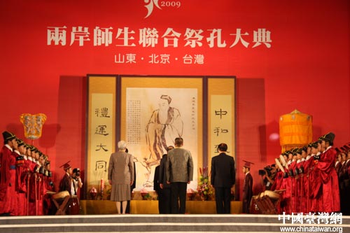 孔子第73代嫡系玄孫、北大教授孔慶東(中)與孔子第78代玄孫、忠信學校畢業生孔維暄(右),在祭孔大典上相遇,二孔本家今日跨海相見,所有與會嘉賓有緣一同見證這一場“中華血緣的神奇之旅”。(中國臺灣網 李杰 攝)