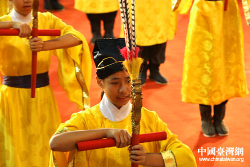 108位來自孔子故里山東、北京、以及臺灣忠信學校的學生擔任了祭孔儀式的禮生、佾生、樂生。(中國臺灣網 李杰 攝)