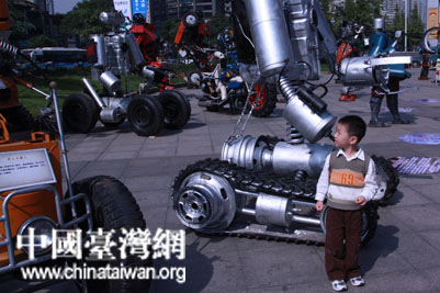 圖為杭州市兒童在展區(qū)內參觀由報廢車輛改裝的藝術品 (中國臺灣網(wǎng) 徐維彬/攝)