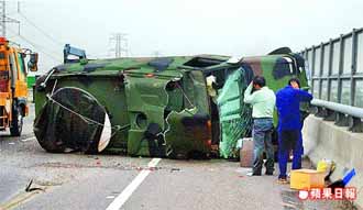 臺(tái)軍用天頻車(chē)傾覆,駕駛兵(右一)及隨車(chē)士官長(zhǎng)(右二)自行爬出車(chē)外。 來(lái)源:臺(tái)灣《蘋(píng)果日?qǐng)?bào)》