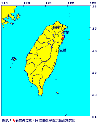 各地最大震度:宜蘭、花蓮、臺北和桃園為3級,南投、臺中為2級,臺北市和花蓮市為1級。(陳佳慧)