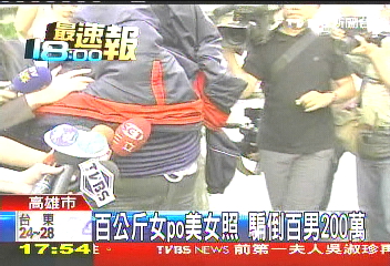 據臺灣TVBS電視臺報道,這名犯罪嫌疑人尤小姐,現年27歲,身高170公分,體重上百公斤,但卻冒用漂亮女網友的照片,在網路聊天室化名雯雯、小娟、嘉恩等6種名字,騙了100多個男網友,3年來騙到200萬元,其中一名在鋼鐵業工作的男子被騙最多。高雄市刑大分隊長顏大晉:“最高(金額)的被害人,一次就被他前后總共被騙105萬。”