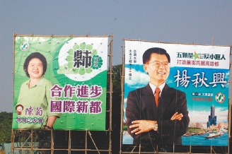 中國臺灣網1月18日消息 據臺灣《聯合報》報道,年底大高雄市長選舉,民進黨上演“秋(高雄縣長楊秋興)菊(高雄市長陳菊)之爭”。兩人比鄰豎立廣告牌,“合作進步,國際新都”與“五顆星南方小巨人”互別苗頭。(高大林)