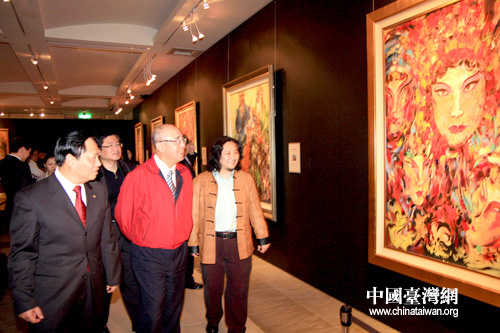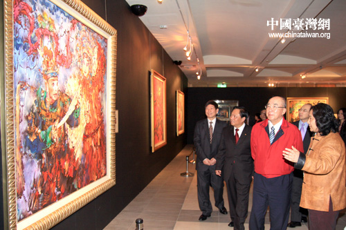 2月1日,中國國民黨榮譽主席吳伯雄在全國臺聯(lián)會長梁國揚陪同下參觀了在臺北市孫中山紀念館展出的國粹油畫精品。 (中國臺灣網(wǎng) 田云鵬 攝)
