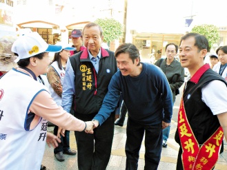 國民黨秘書長金溥聰(右二)上午陪為國民黨籍花蓮“立委”候選人王廷升(右一)助選,稱蕭美琴欠臺灣人民一個道歉。 來源:臺灣《聯合晚報》