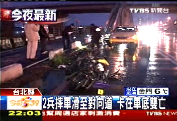 中國臺灣網2月19日消息 臺北縣昨晚發生一起死亡車禍,2名現役臺憲兵,騎摩托車經過新莊新海橋下堤外便道的時候,可能因為天雨路滑,連人帶車摔到對向車道,卡在計程車底,強大的撞擊力道,讓2個人在送醫后還是不治身亡。