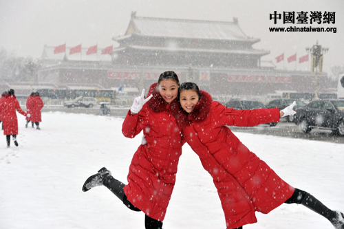 禮儀小姐興奮的映雪起舞。 (中國臺灣網發 肖春陽、劉洋攝)